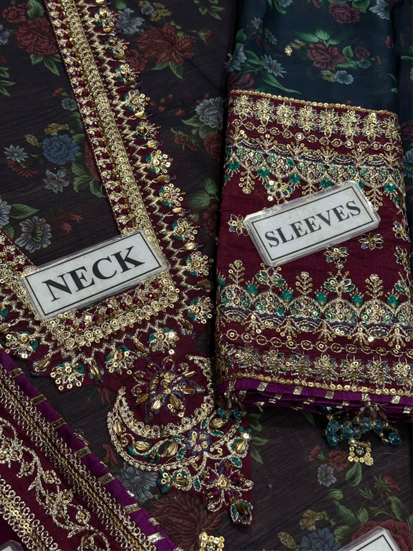 Step into elegance with this stunning BAROQUE chiffon dress, designed for those who love timeless luxury. The outfit features a heavily embroidered chiffon front and sleeves, adding rich detail and class to your look. The embroidered back complements the design beautifully.