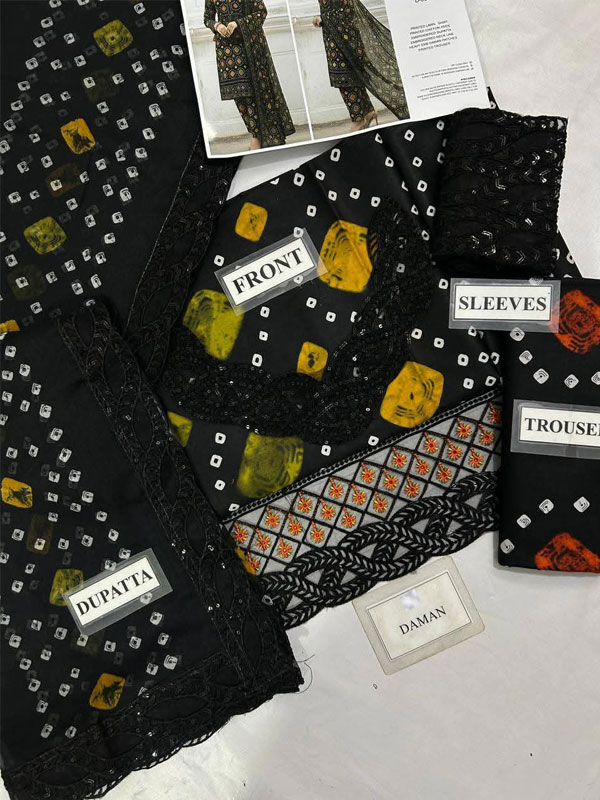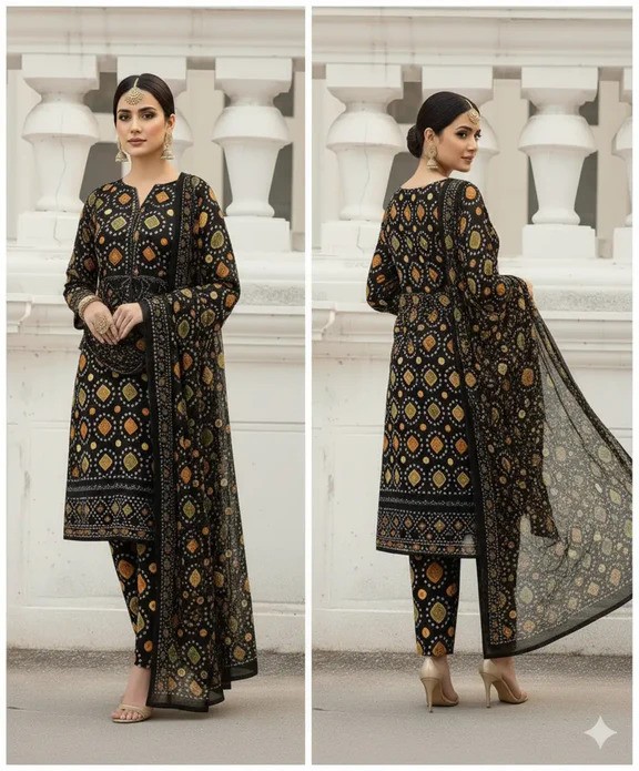 The Digital Printed Chunri Lawn Dress is an unstitched printed lawn outfit from the Spring/Summer 2025 Lawn Printed Collection. It features a digital printed front with an embroidered neckline, a printed back, and printed sleeves complete with borders. The set includes a printed chiffon dupatta and matching printed trousers, offering a fully coordinated look. Designed in the colors and patterns shown in the pictures, this attractive ensemble is perfect for casual wear and adds a fresh, stylish touch to your summer wardrobe.