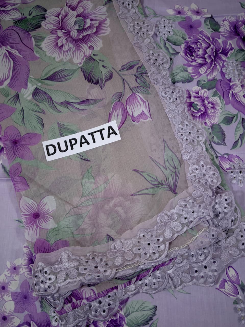 •Digital Printed Chiffon Dupatta With 4 Sided Embroidered Laced