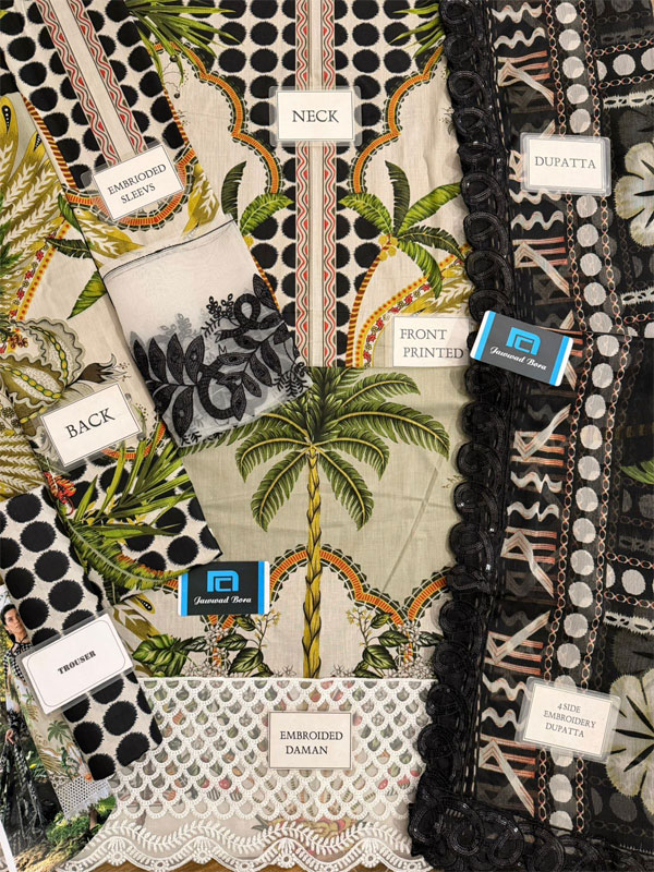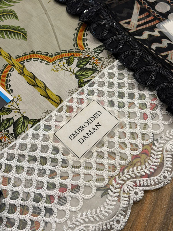 • Shirt Front: Printed Lawn Front with Heavy Embroidered Spangle Work Daman Border and Embroidered Spangle Work Chak Lace